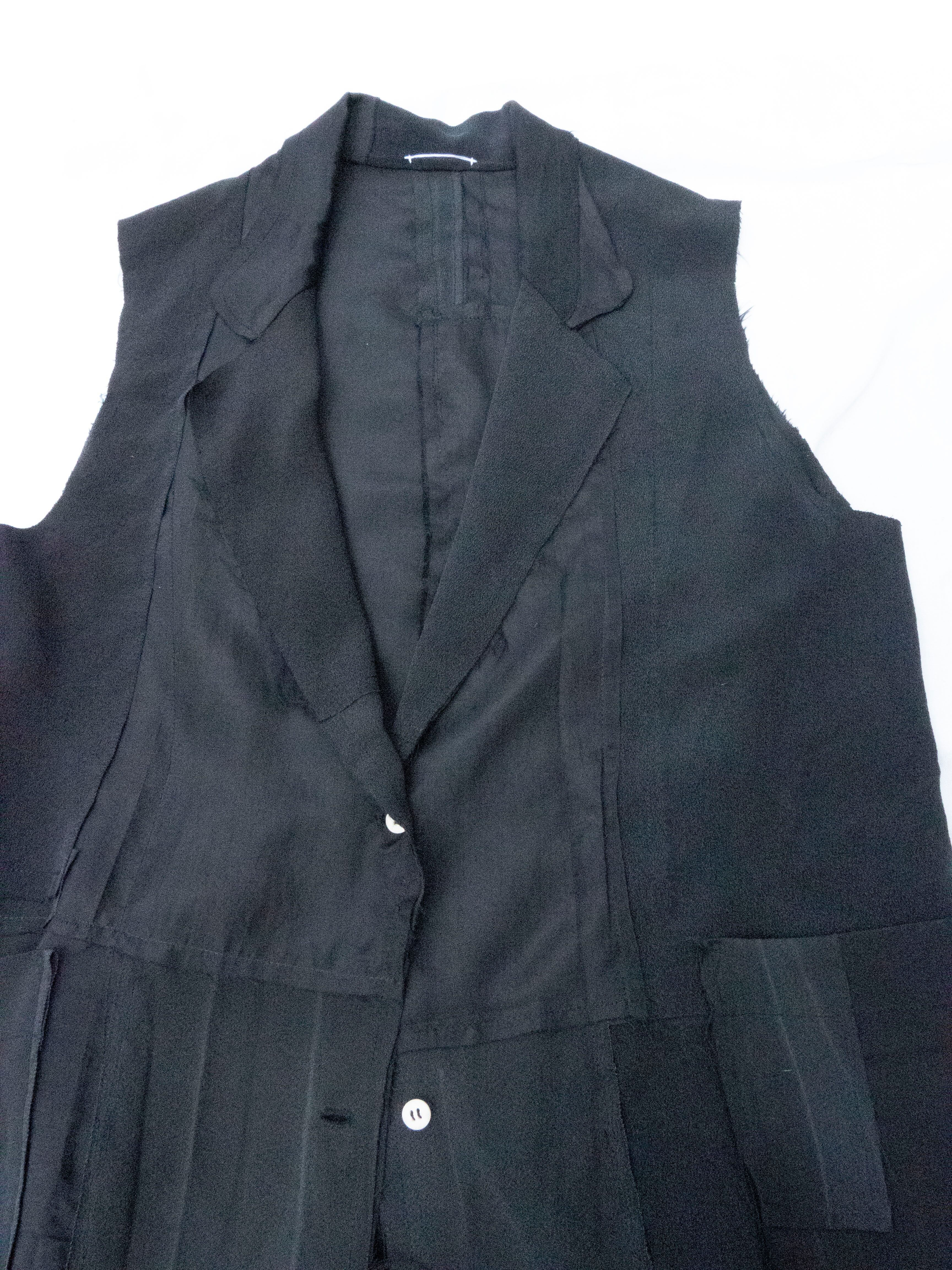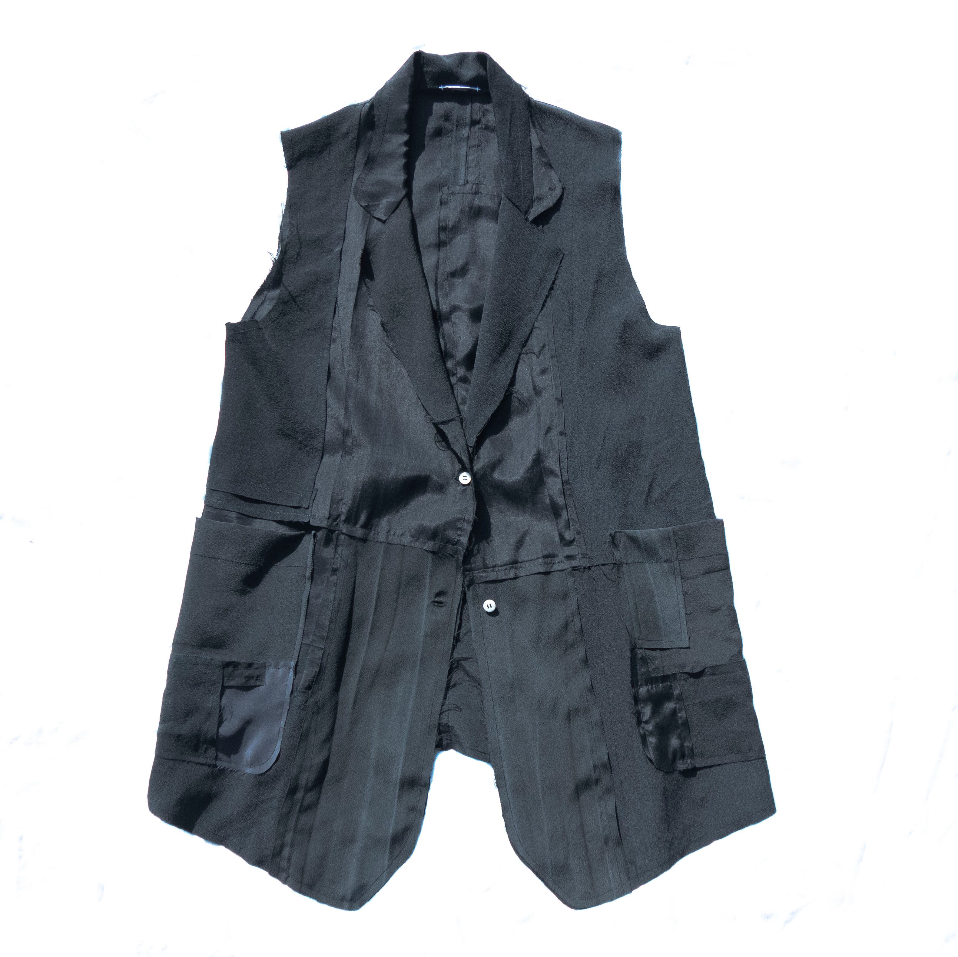 black raw edged patched no sleeve shirts made by scraps of silk kimono(hagire) MOMOZONO original