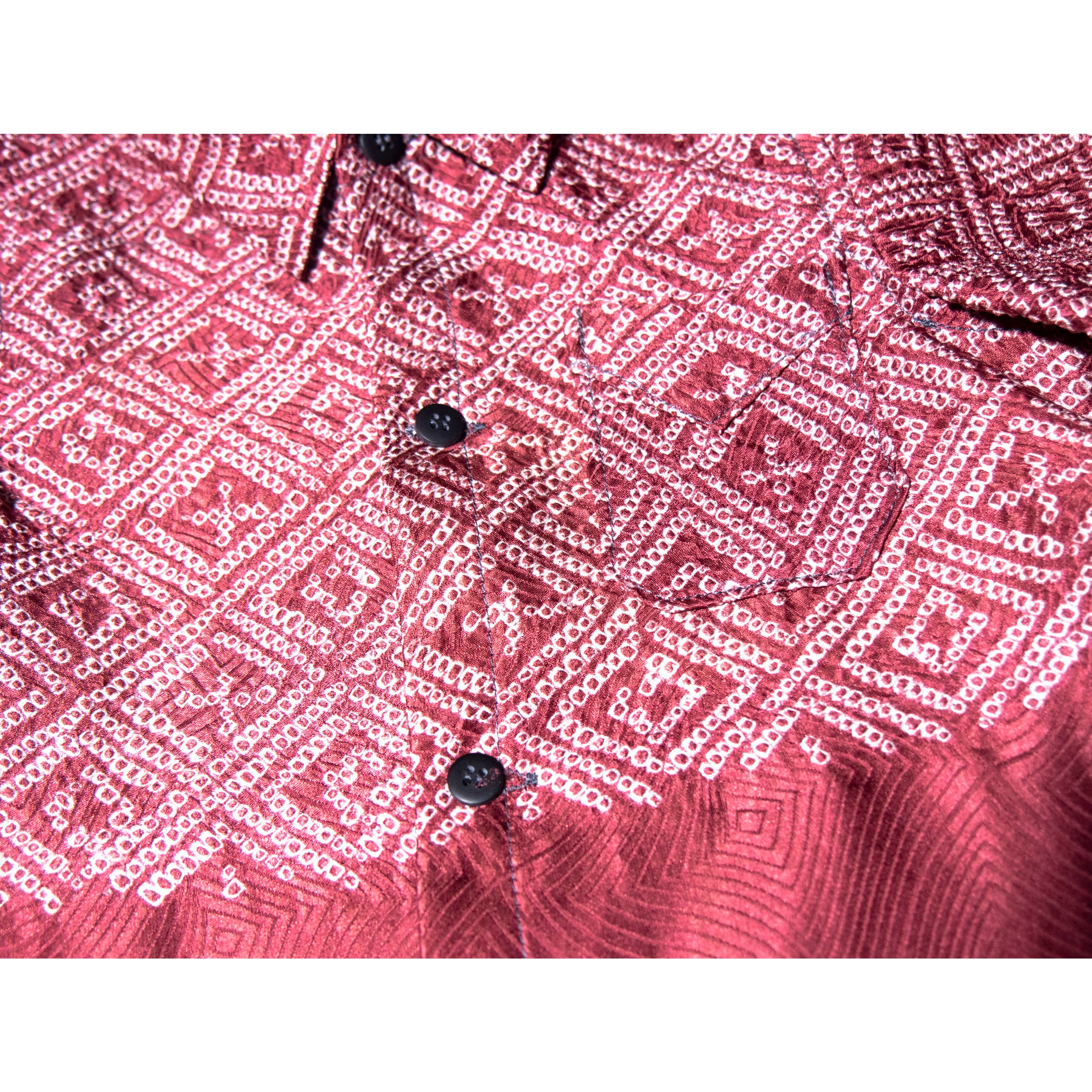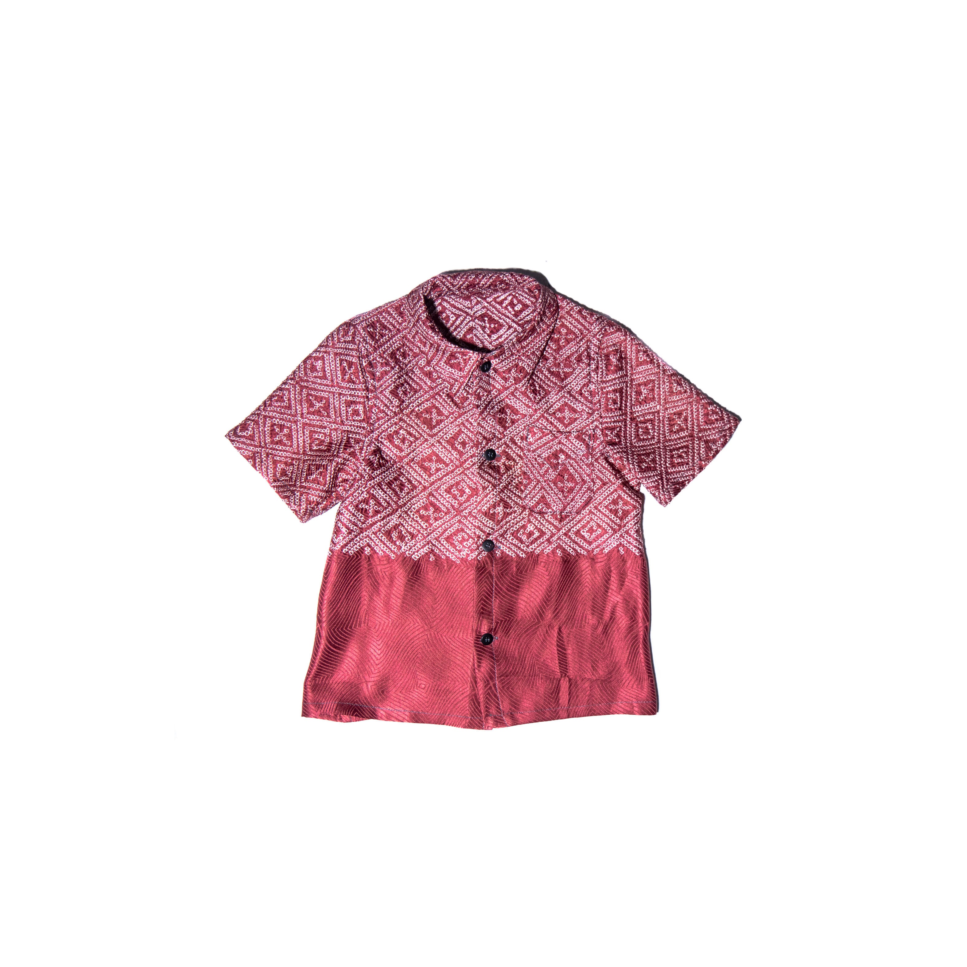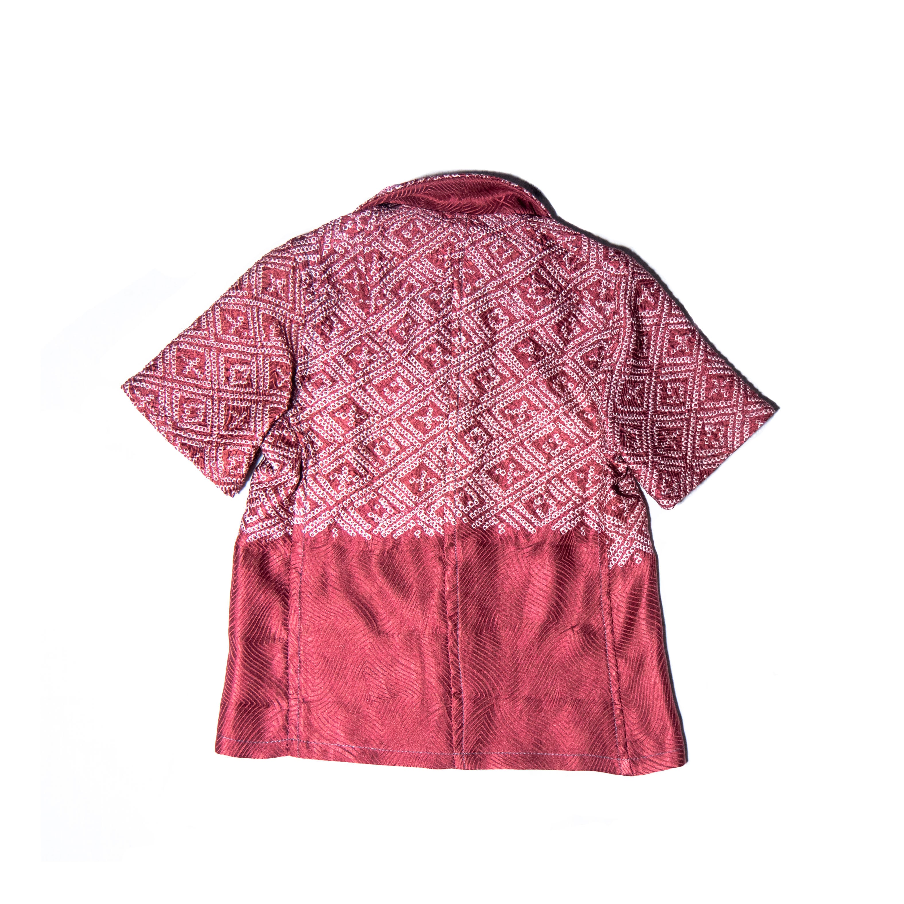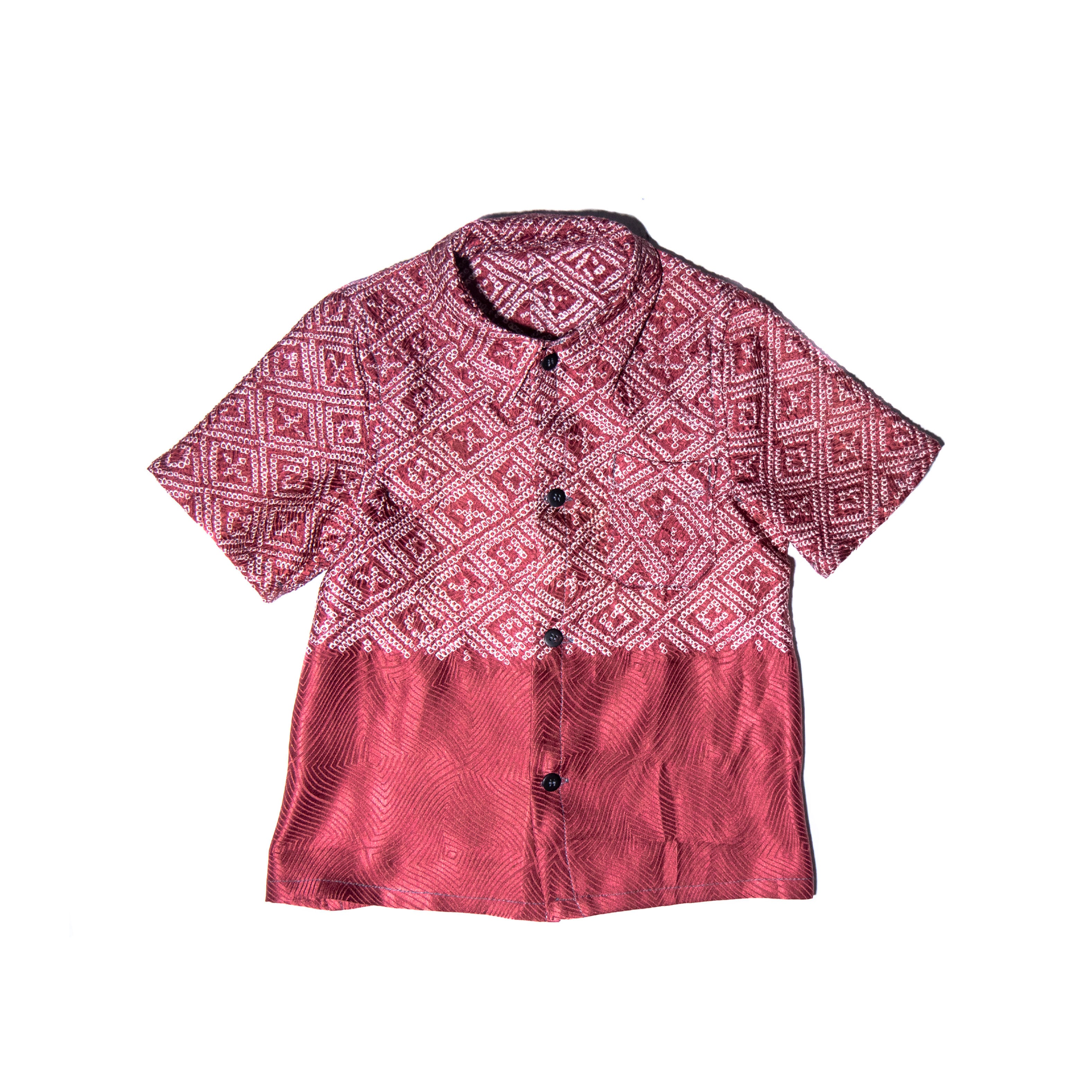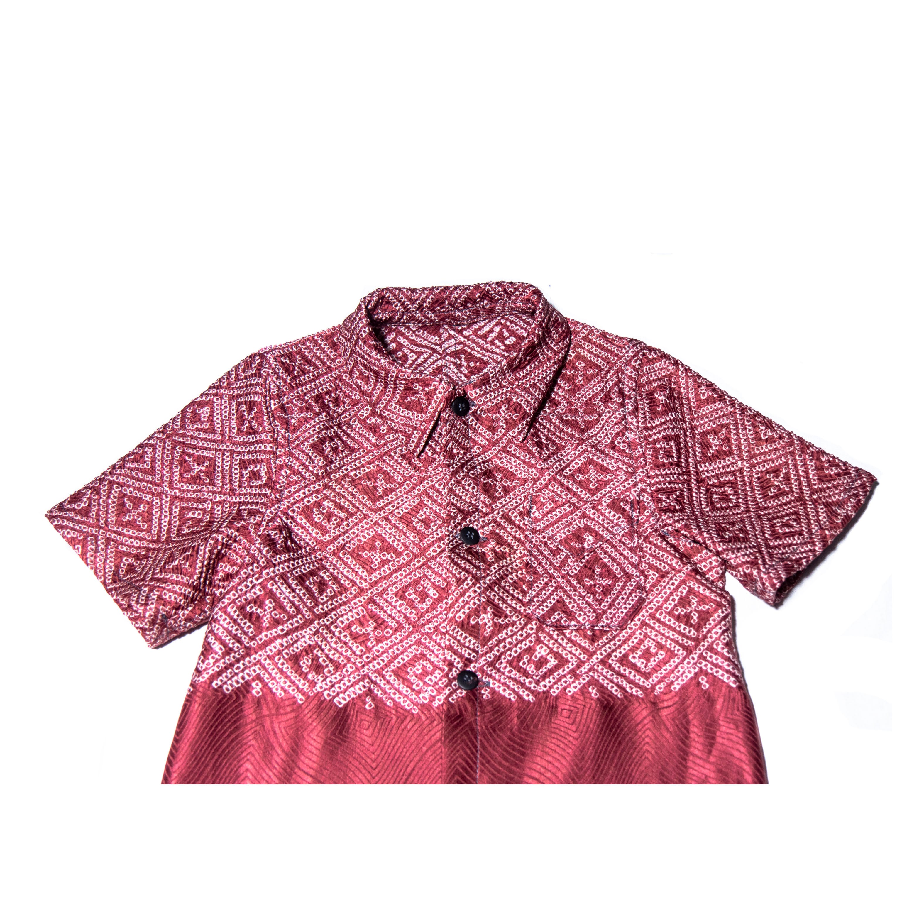 ボルドー色、シルク手絞りアンティーク着物リメイク、子供用半袖シャツ(約1才から4才)MZ original